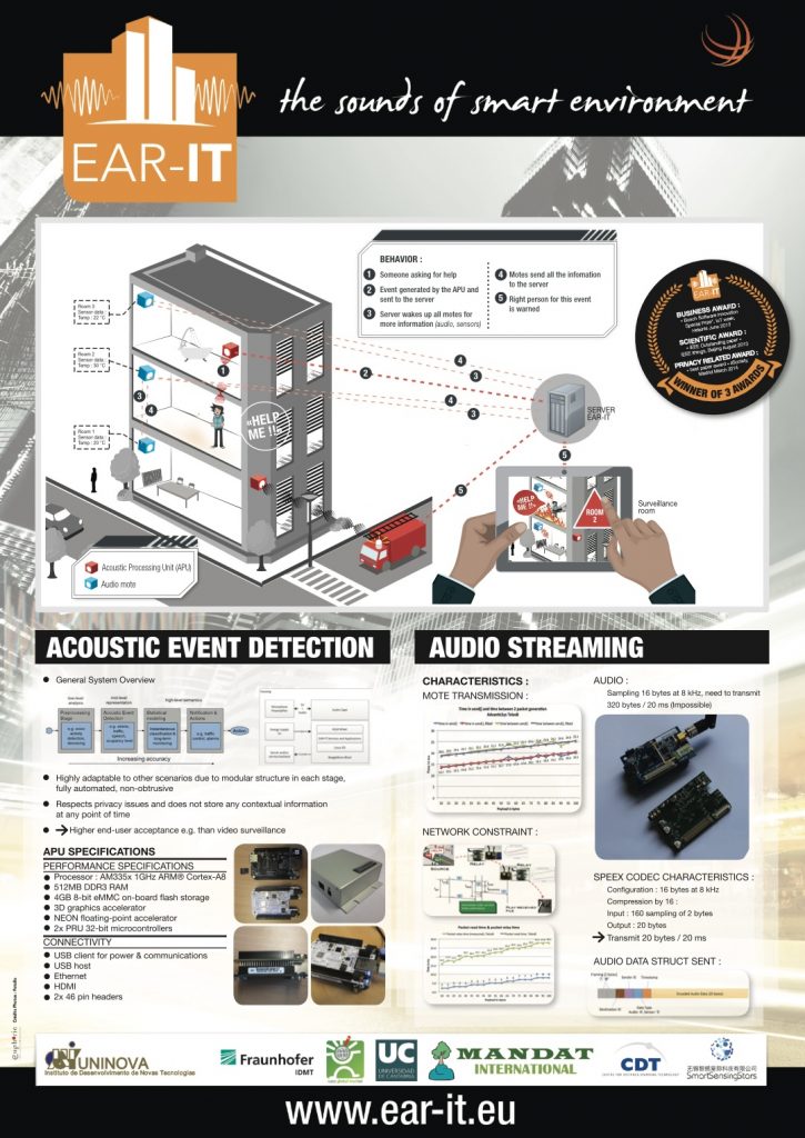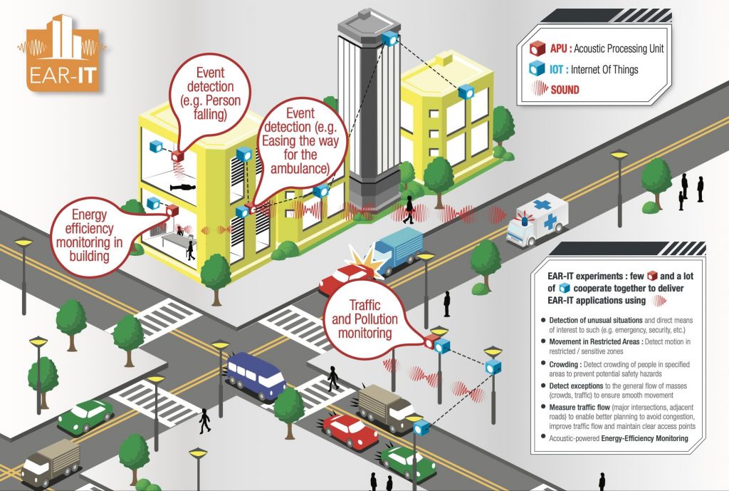 The general objectives of the EAR-IT project was to monitor sounds in urban environments in order to detect and process particular events. The following illustration describes the project’s main objectives.
