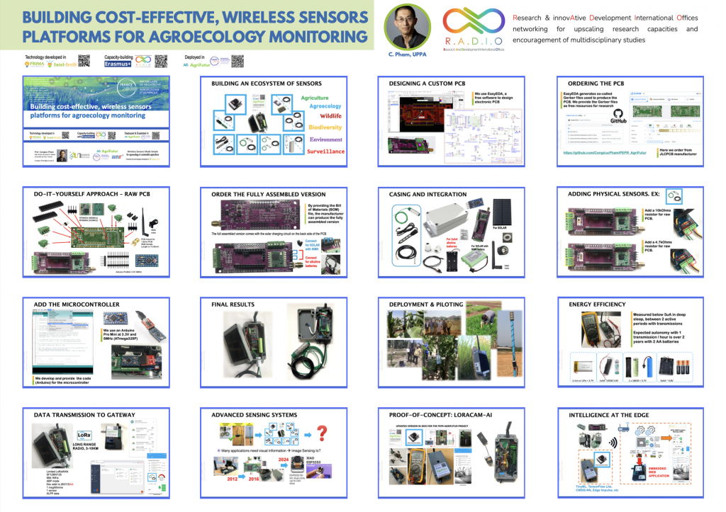 Jan. 27th, 2026. Design of a poster illustrating all the steps to build cost-effective sensing systems based on the open & generic sensing platform developed in the PRIMA INTEL-IRRIS project and now deployed and exploited in the AgriFutur flagship project of the PEPR program. Download the A0 poster in .pdf. You can also download the set of slides that were used for the poster. The poster will be used to interact with students at the 2026 edition of the UPPA TRANSITION WEEK that will be organized on March 24-27, 2026 (here is the link to the 2025 edition). Pr Congduc Pham will welcome students in the UPPA/ENSGTI FabLab where demonstrators will be showcased to illustrate the multidisciplinary approach in science promoted and implementated by RADIO.
