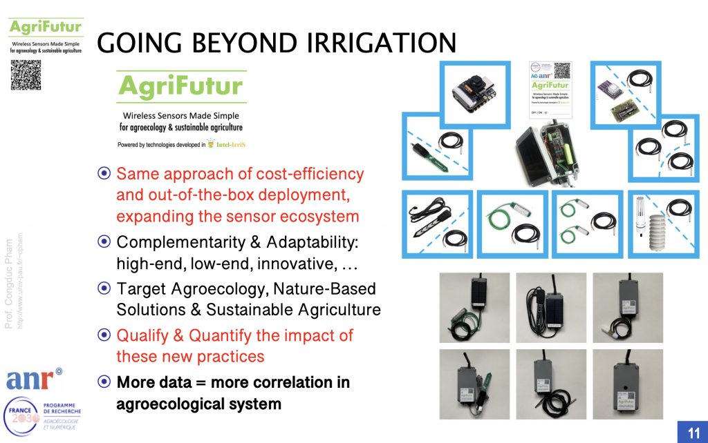 Nov. 25th, 2025. Pr. Congduc Pham, coordinator of PRIMA INTEL-IRRIS and in charge of developing the sensing system framework in PEPR AgriFutur, presented a synthesis of sensing technologies initially developed in INTEL-IRRIS and that will be extended and further deployed for agroecology applications in AgriFutur the Africomm’2025 conference. You can download the following resources: